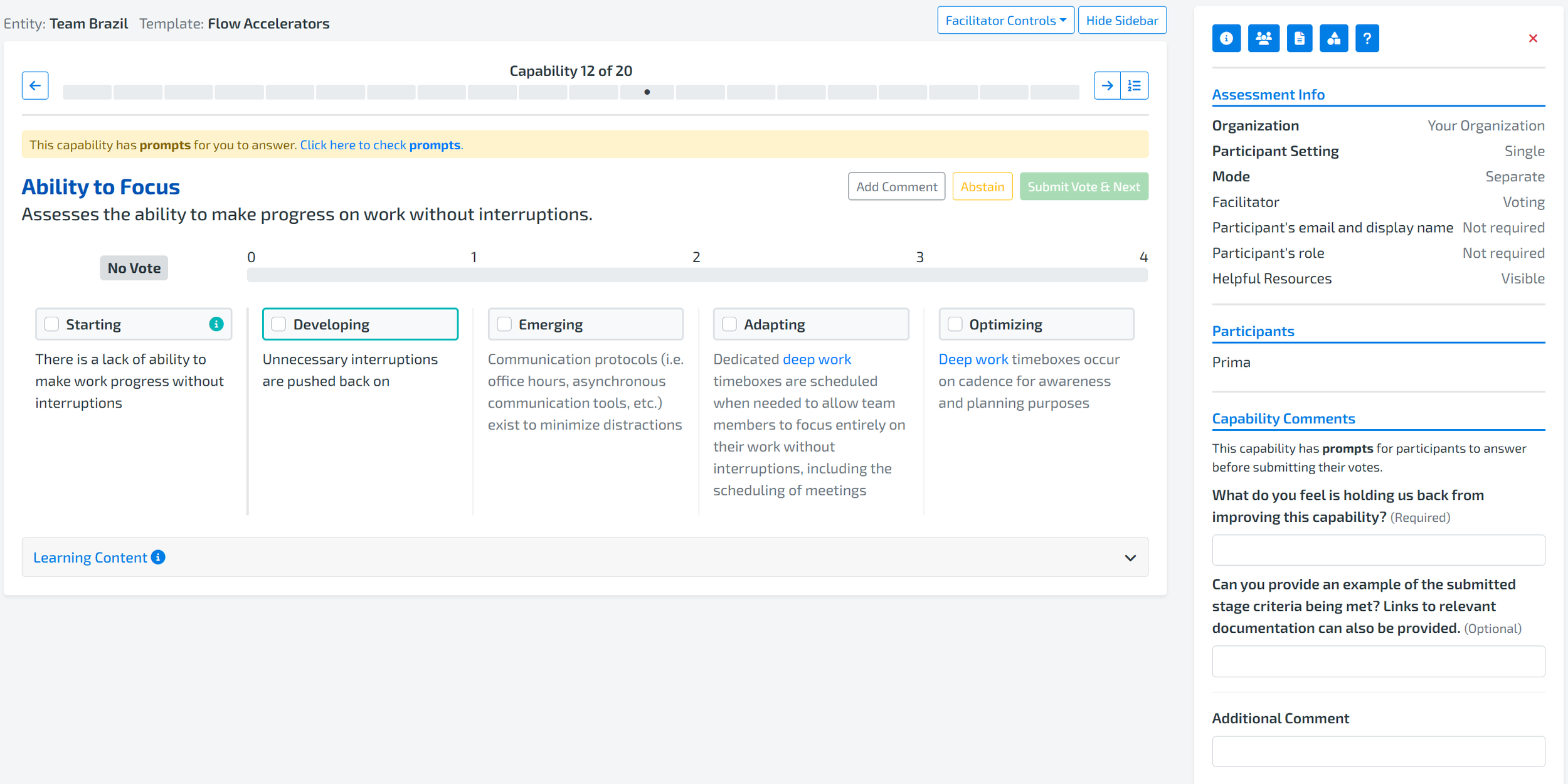 Participants are able to respond to a prompt before or after providing the vote on the capability. However, participants are unable to navigate back to respond to a prompt if the Facilitator has moved everyone forward.