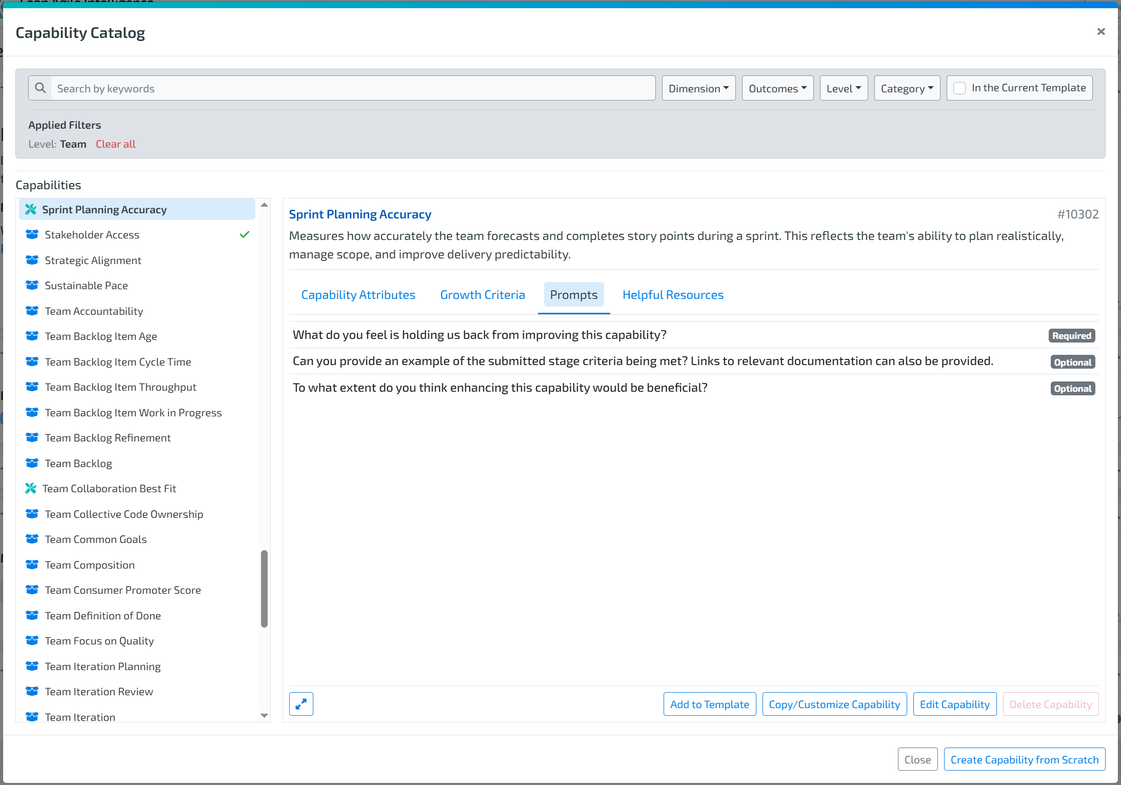 With Capability Prompts, administrators can create specific prompts to gather insights on particular capabilities. There is also an option to make these prompts required.