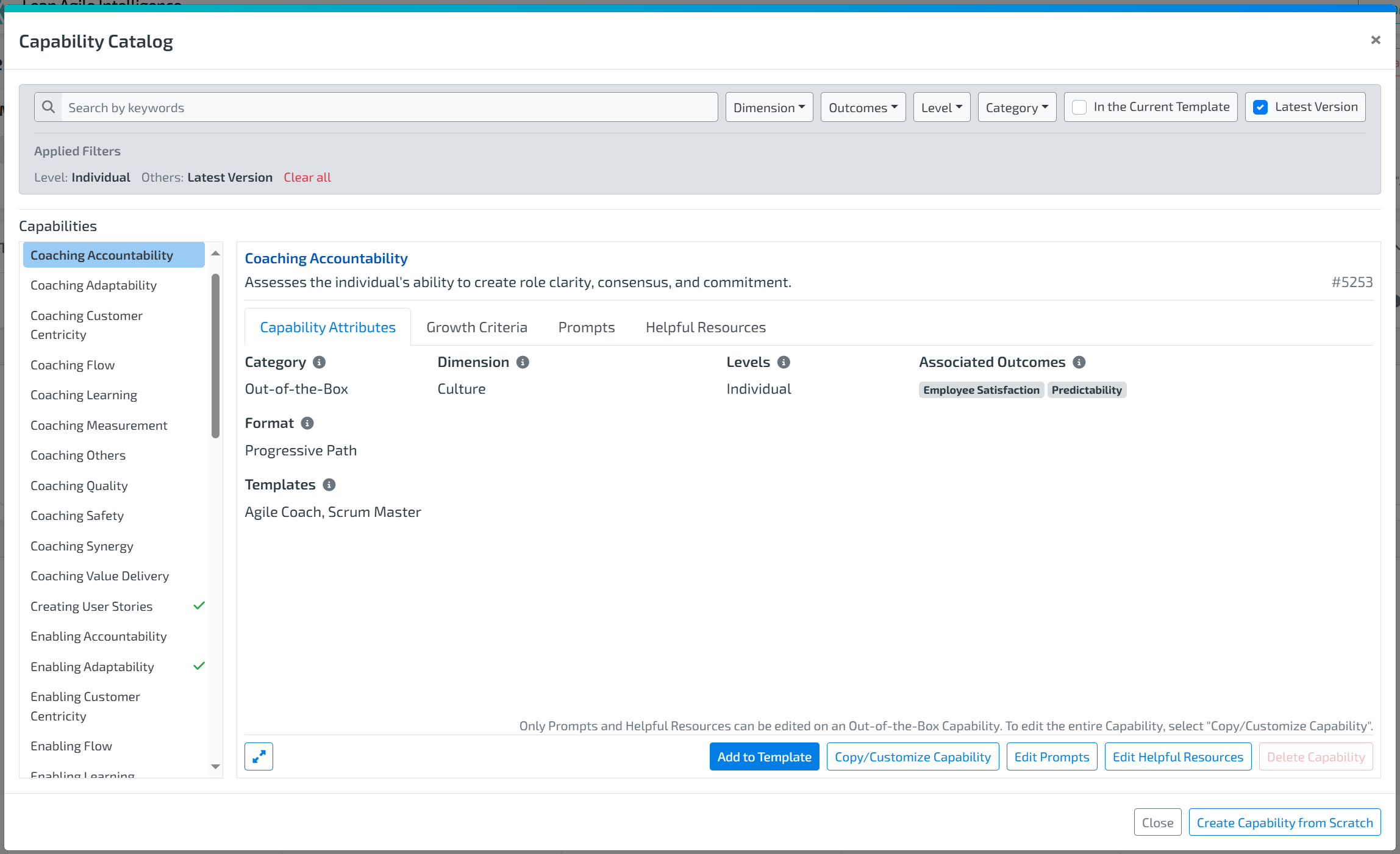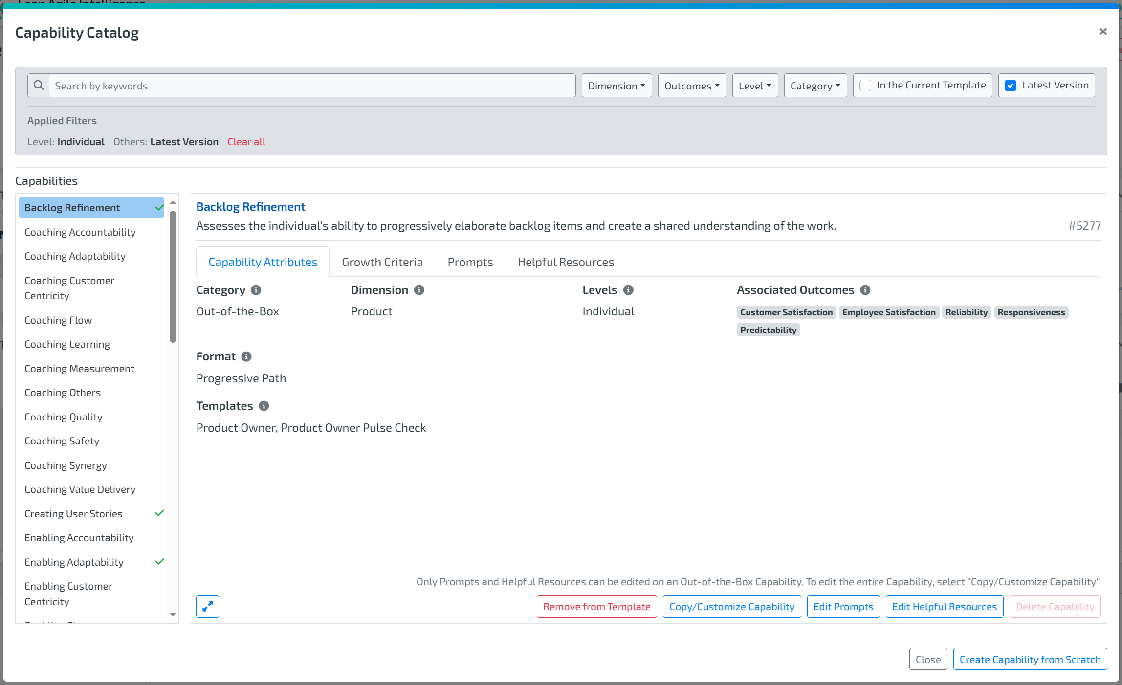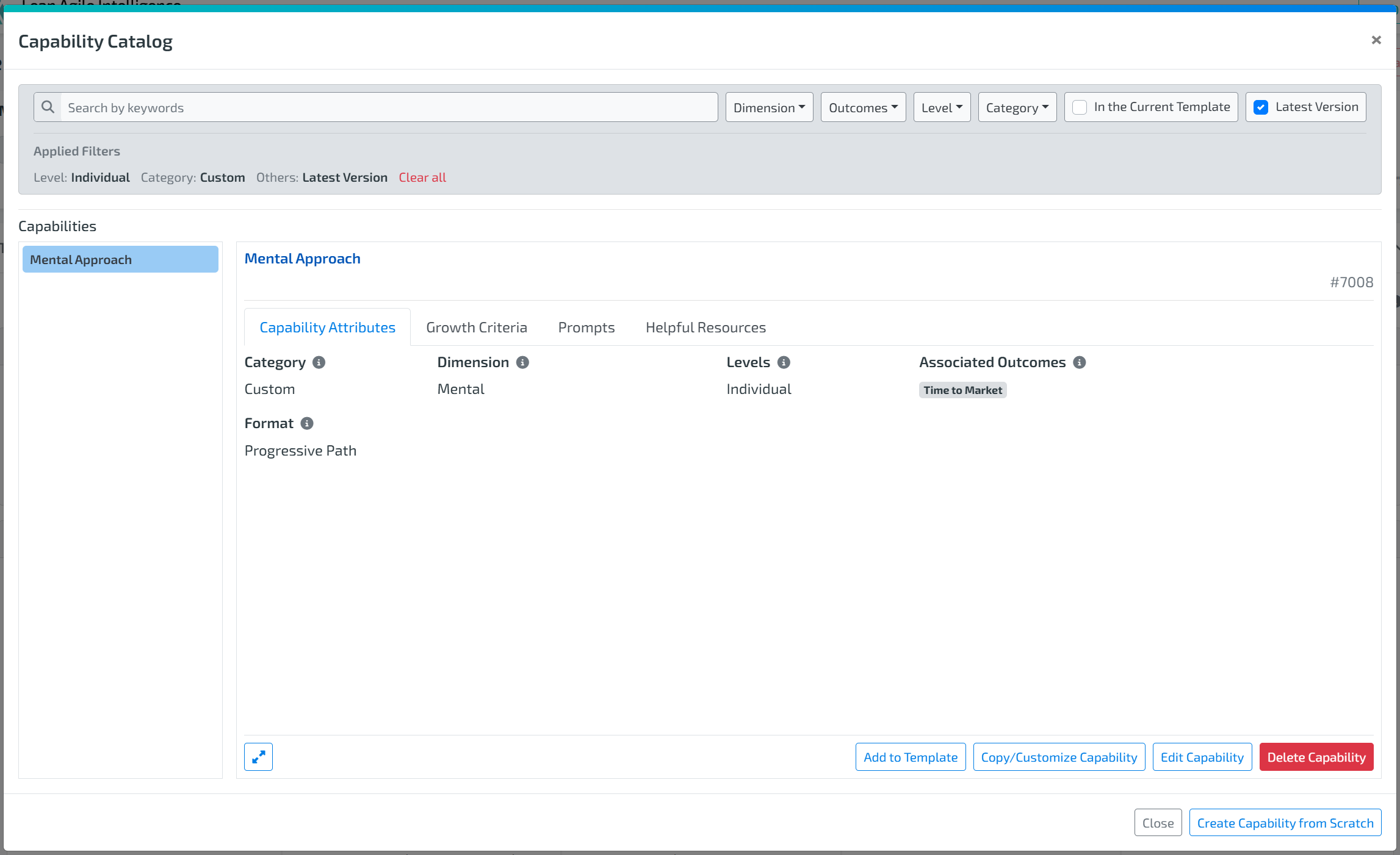 Customize an existing “Growth Criteria” by clicking on it and selecting “Copy/Customize”. Note that only Admins have permission to edit Capabilities.