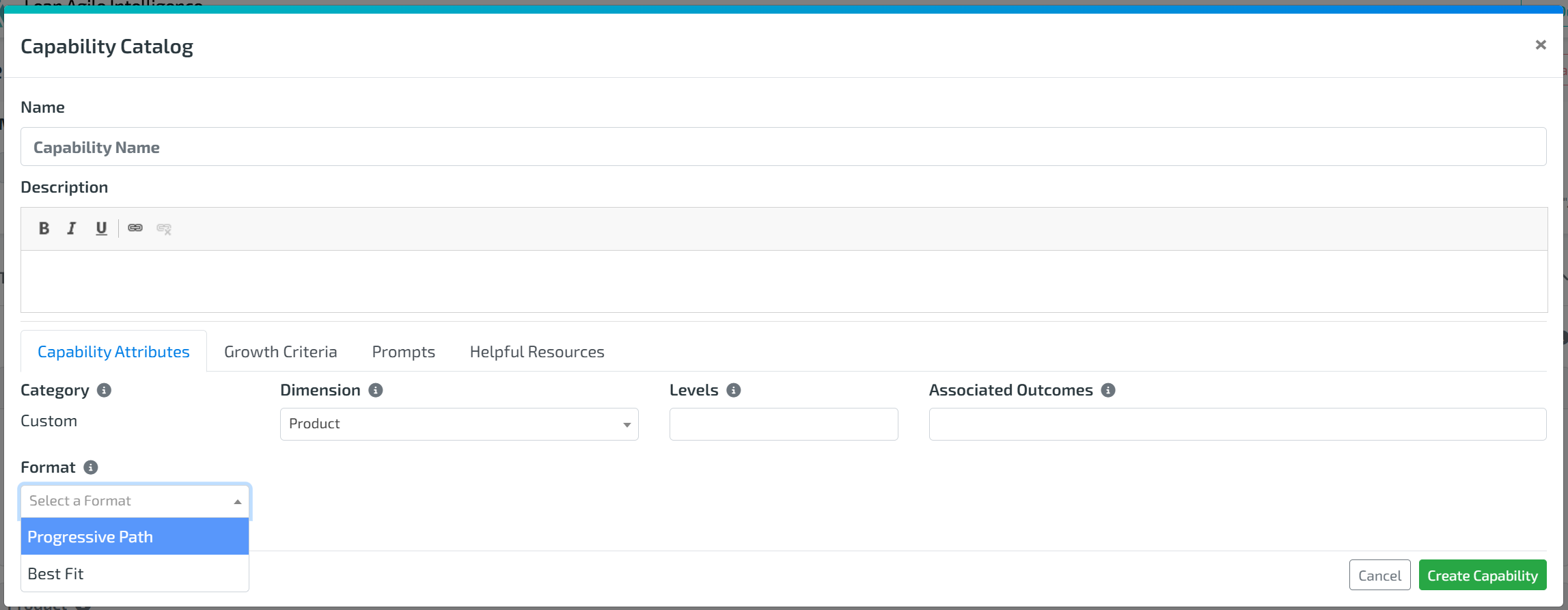 4. Select the Format type for the capability: Progressive Path or Best Fit.