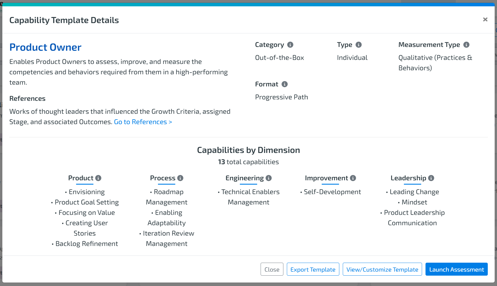 “Export Template” is available to be enabled only for LAI customers. Please contact sales for more information on how to export capability templates. If you are a paid customer, please reach out to your organization's administrator for further details.