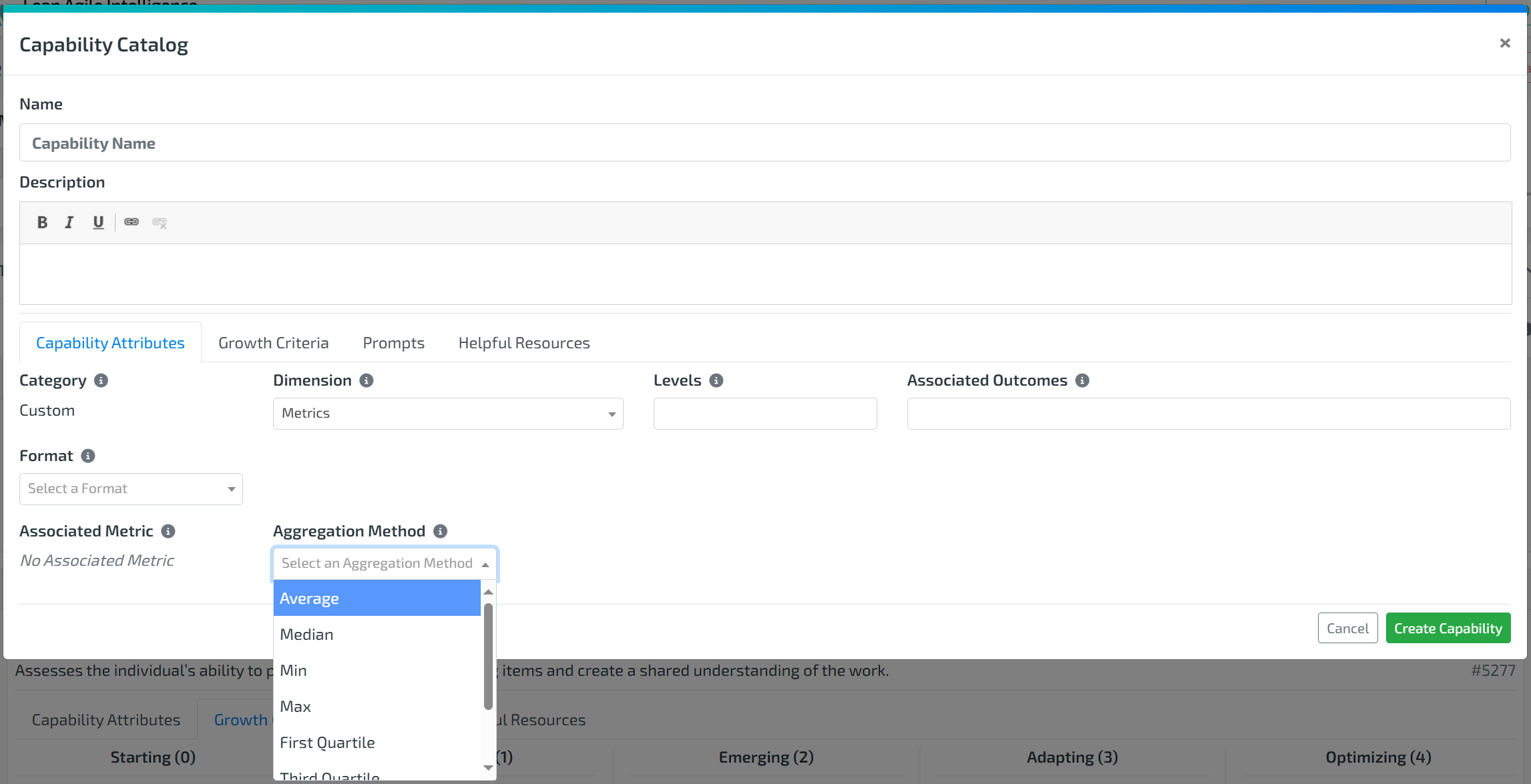 5. If the Capability Dimension is a Quantitative type, you are required to select an Aggregation Method. The available aggregation methods are:
