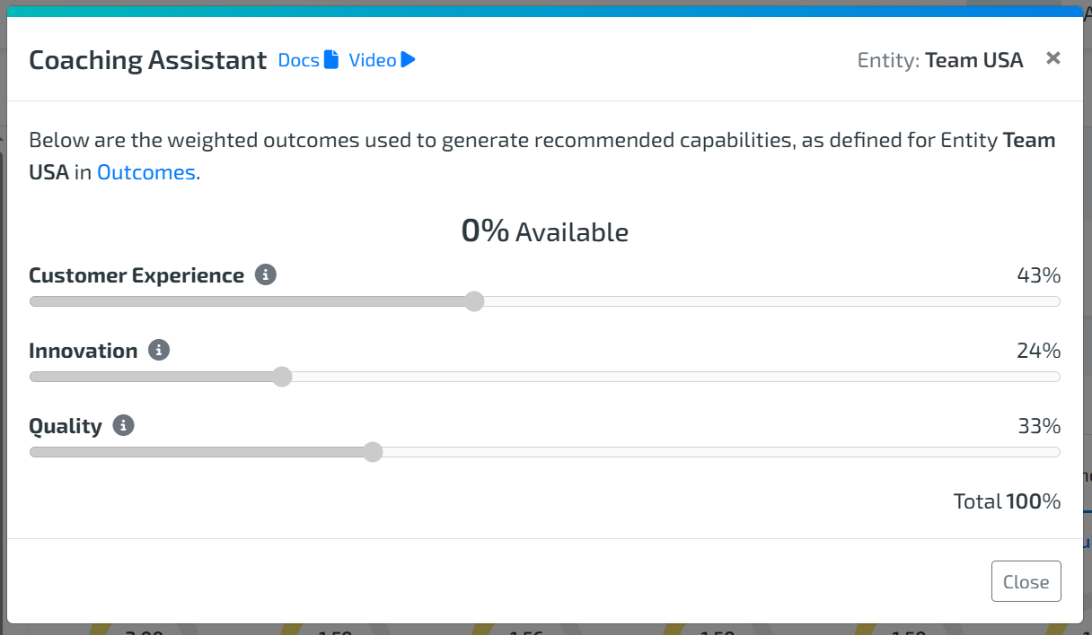 Click “Open Coaching Assistant” to view the weighted outcomes that are being used to generate the recommendations. The weighted outcomes used may be inherited from a parent Group or the Organization.