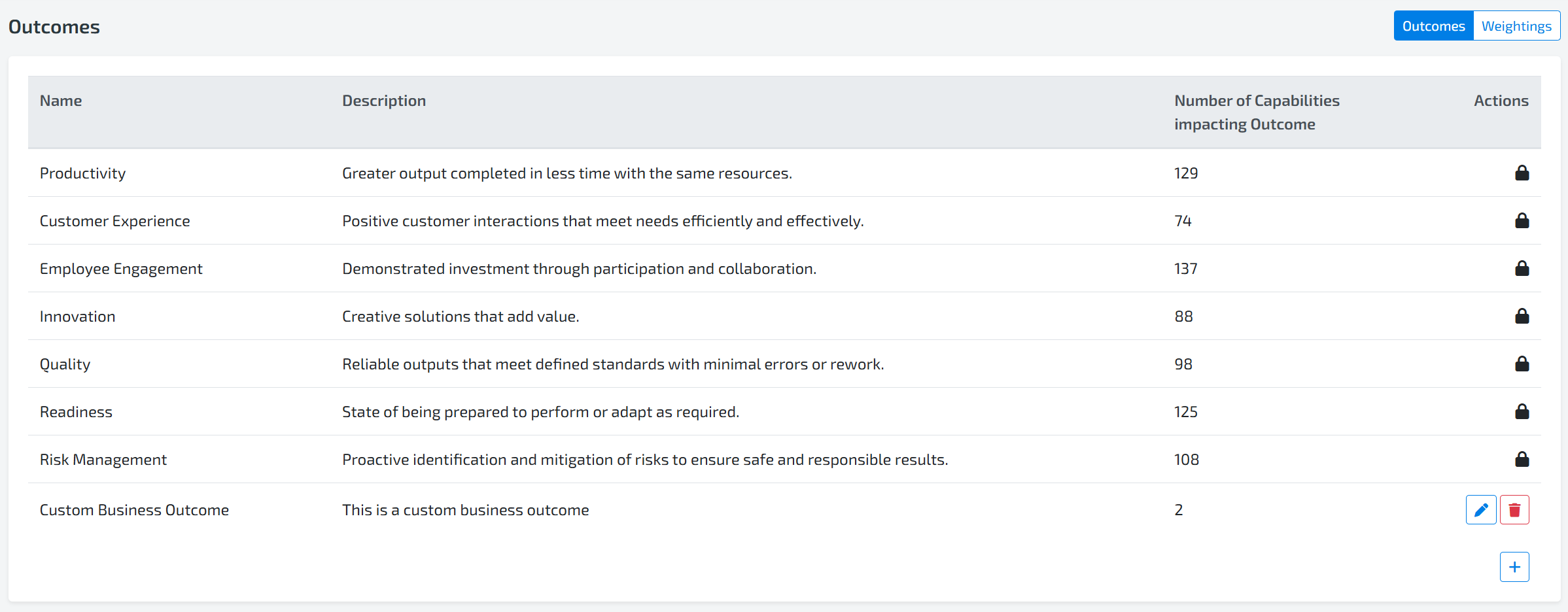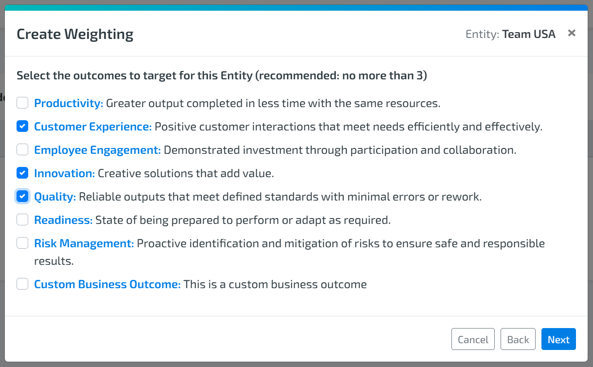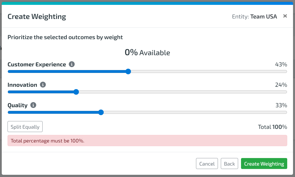 In addition to team-level inputs, Organization Admins can predefine weightings of targeted outcomes to create alignment across the organization.