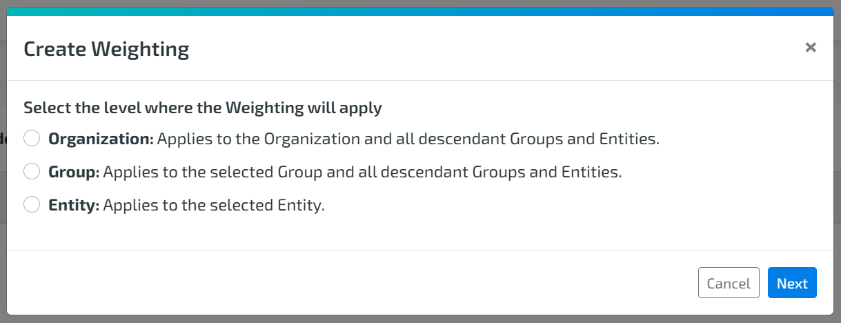 Choose where the weighting should apply:Organization → Applies to the entire organization and all descendants