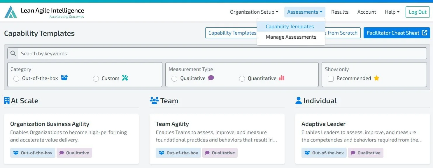 After registration, you will be presented with the Capability Templates page that lists all of our Out-of-the-Box templates as a starting point to your measurement strategy with Lean Agile Intelligence.